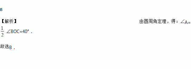 如图,A、B、C三点都在⊙O上,若∠BOC=80°,则∠A的度数等于( )