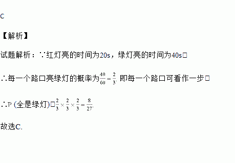 小明从家里出发到学校共经过3个路口,每个路口都有红绿灯,如果红灯亮的时间为20秒,绿灯亮的时间为40秒,那么小明从家里出发到学校一路通行无阻的概率是( )