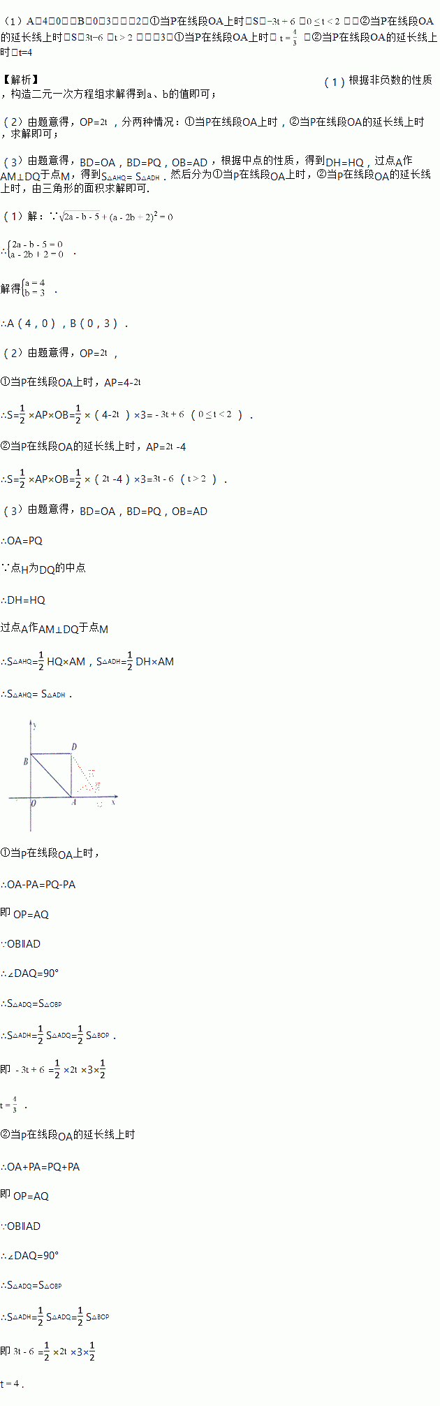 (3)在(2)的条件下,将线段OB沿x轴正方向平移,使点O与点A重合,点B的对应点为点D,连接BD,将线段PB沿x轴正方向平移,使点B与点D重合,点P的对应点为点Q,取DQ的中点H,是否存在t的值,使三角形ABP的面积等于三角形ADH的面积?若存在,求出t的值;若不存在,请说明理由.