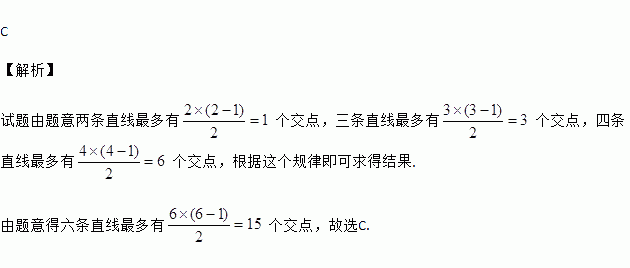 两条直线最多有1个交点,三条直线最多有3个交点,四条直线最多有6个交点,…那么六条直线最多有( )