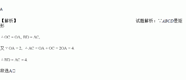 如图,在矩形ABCD中,对角线AC、BD相交于点O,若OA=2,则BD的长为( )