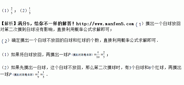 (1)如果将这个白球放回,再摸出一球,那么它是白球的概率是多少?