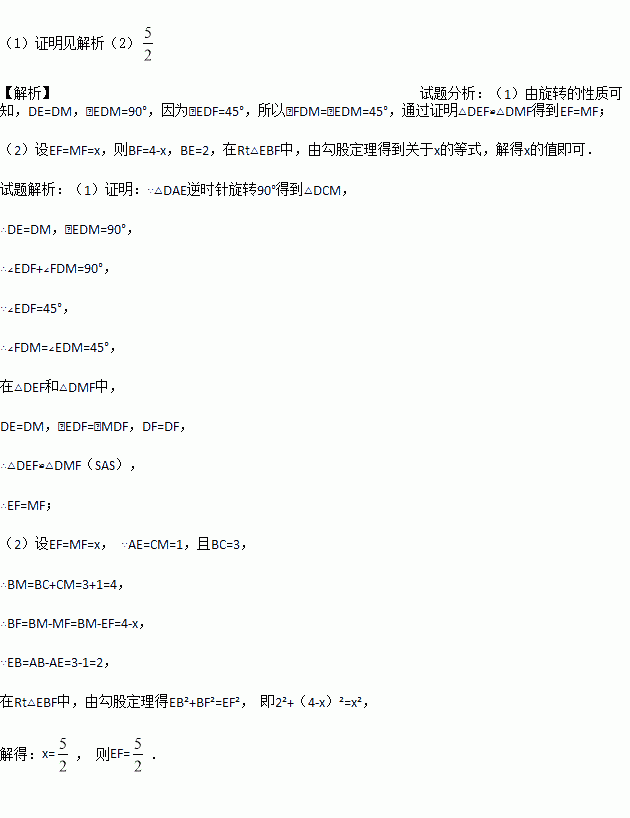 如图,正方形ABCD的边长为3,E,F 分别是AB,BC边上的点,且∠EDF=45°.将△DAE绕点D逆时针旋转90°,得到△DCM.