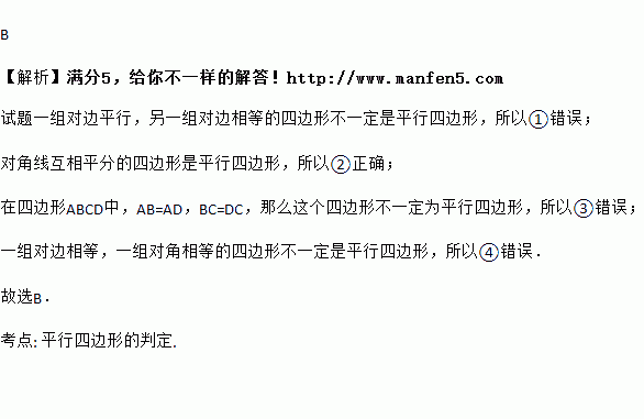 下列命题:①一组对边平行,另一组对边相等的四边形是平行四边形;②对角线互相平分的四边形是平行四边形;③在四边形ABCD中,AB=AD,BC=DC,那么这个四边形ABCD是平行四边形;④一组对边相等,一组对角相等的四边形是平行四边形。其中正确命题的个数是( )。
