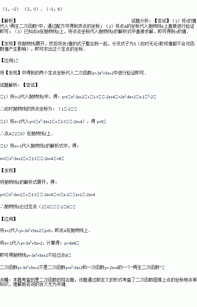 称为这两个函数的“再生二次函数”,其中t是不为零的实数,其图象记作抛物线E。现有点A(2,0)和抛物线E上的点B(-1,n),请完成下列任务: