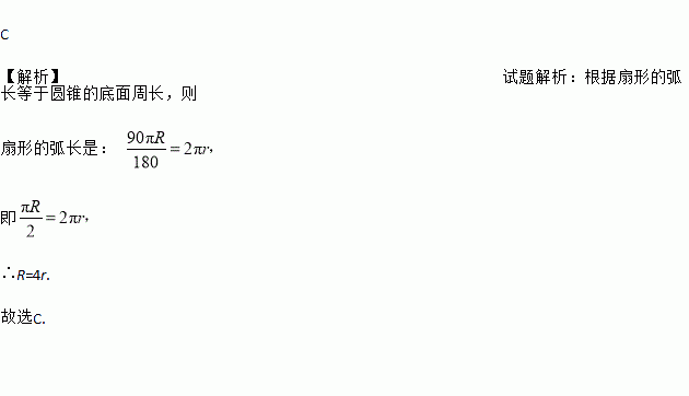 C 【解析】试题解析:根据扇形的弧长等于圆锥的底面周长,则 扇形的弧长是: 即 ∴R=4r. 故选C.