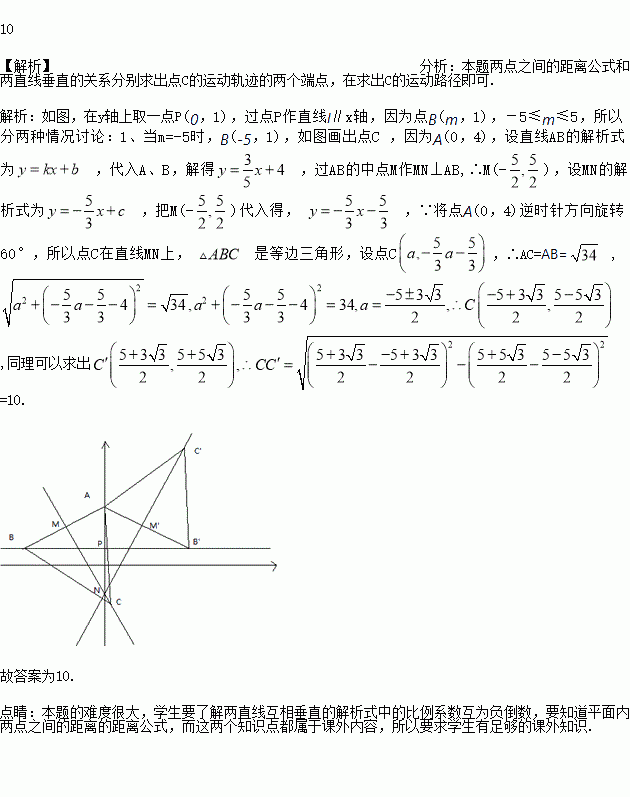 在平面直角坐标系中,点C沿着某条路径运动,以C为旋转中心,将点A(0,4)逆时针旋转60度,到B(m,1).若,则点C的运动路径长是_________________。
