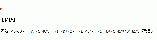 如图,已知AB∥CD,∠A=40°,∠D=45°,则∠1的度数是 ( )