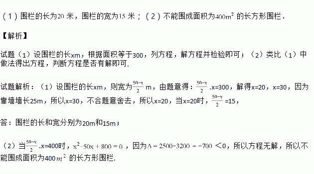 能否围成面积为的长方形围栏?如果能,求出该长方形的长和宽,如果不能请说明理由.