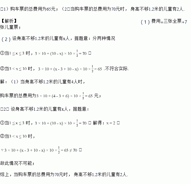 (2)若这次购车票的总费用为70元时,身高不够1.2米的儿童有多少人?