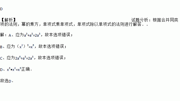 A. a3+a3=2a6 B. (x2)3=x5 C. 2a6÷a3=2a2 D. x3•x2=x5