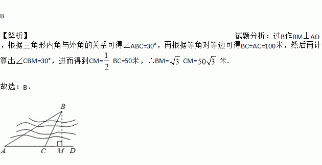 如图,要测量B点到河岸AD的距离,在A点测得∠BAD=30°,在C点测得∠BCD=60°,又测得AC=100米,则B点到河岸AD的距离为( ).