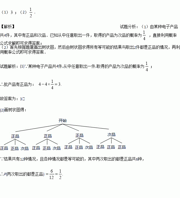 某种电子产品共4件,其中有正品和次品.已知从中任意取出一件,取得的产品为次品的概率为