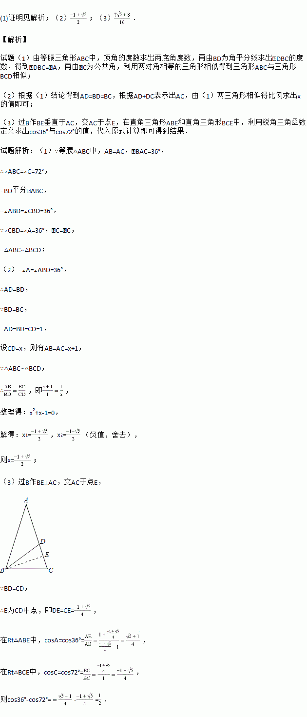 如图,等腰△ABC中,AB=AC,∠BAC=36°,BC=1,点D在边AC上且BD平分∠ABC,设CD=x.
