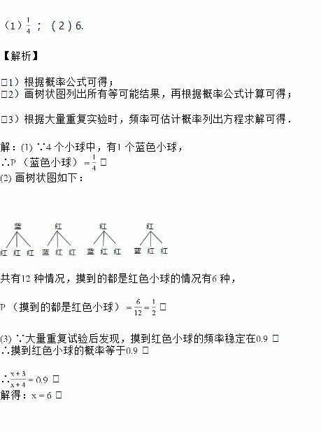 个,用列表法或树状图法求摸到的都是红色小球的概率;![]()