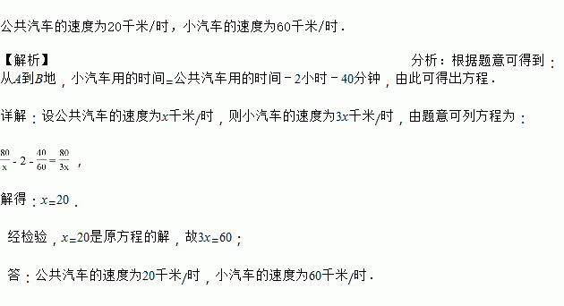 A、B两地相距80千米,一辆公共汽车从A地出发,开往B地,2小时后,又从A地同方向开出一辆小汽车,小汽车的速度是公共汽车速度的3倍,结果小汽车比公共汽车早40分钟到达地,求两车的速度?