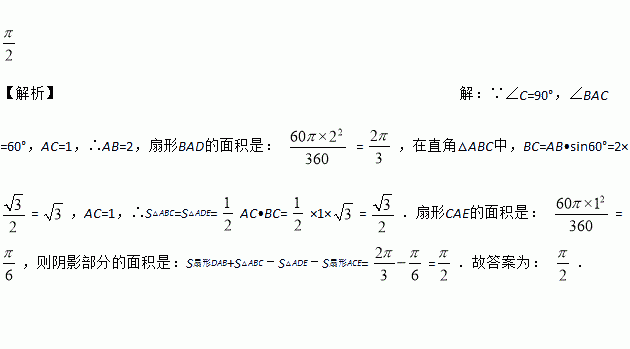 如图,在Rt△ABC中,∠C=90°,∠BAC=60°,将△ABC绕点A逆时针旋转60°后得到△ADE,若AC=1,则线段BC在上述旋转过程中所扫过部分(阴影部分)的面积是_____(结果保留π).