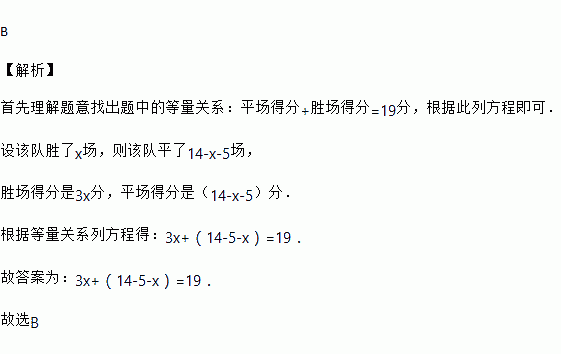 足球比赛记分规则为:胜一场得3分,平一场得1分,负一场得0分,一个队进行了14场比赛,其中负5场,共得分19分,若设胜场次数为x场,则可列方程为( )