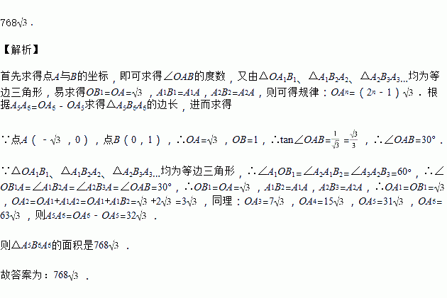 交x轴于点A,交y轴于点B,点A1、A2、A3,…在x轴上,点B1、B2、B3,…在直线l上.若△OB1A,△A1B2A2,△A2B3A3,…均为等边三角形,则△A5B6A6的面积是__.