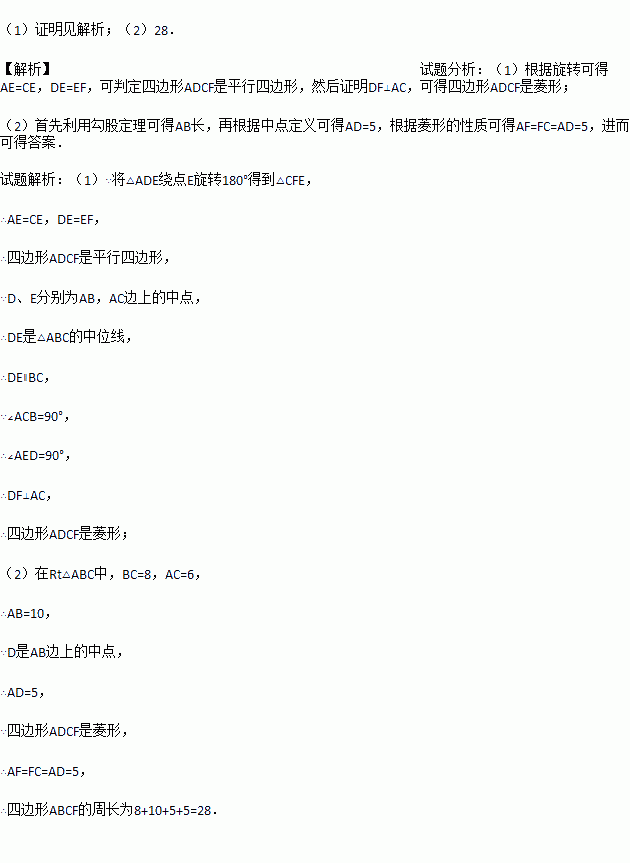 如图,在Rt△ABC中,∠ACB=90°,D、E分别为AB,AC边上的中点,连接DE,将△ADE绕点E旋转180°得到△CFE,连接AF,AC.