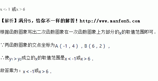 已知二次函数与一次函数的图象交于点,(如图所示),则能使成立的的取值范围是________.