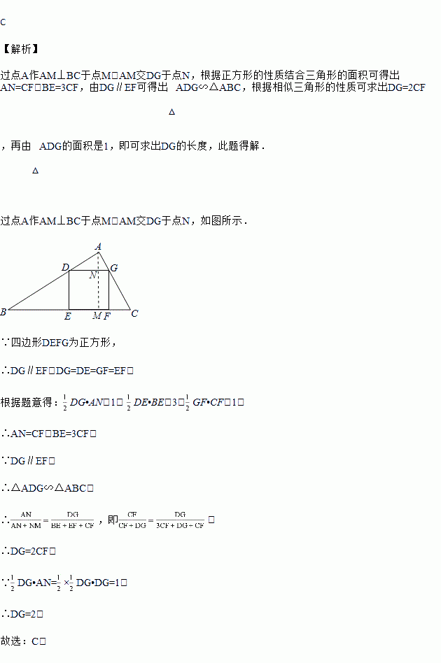 如图,△ABC中,正方形DEFG的顶点D,G分别在AB,AC上,顶点E,F在BC上.若△ADG、△BED、△CFG的面积分别是1、3、1,则正方形的边长为( )