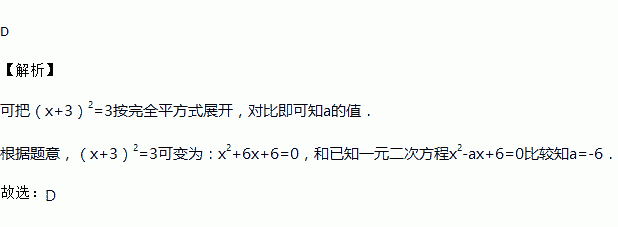 如果一元二次方程x2-ax+6=0经配方后,得(x+3)2=3,则a的值为( )