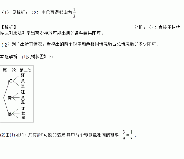 (1) 见解析;(2) 由①可得概率为 【解析】分析:(1)直接用树状图或列表法列举出两次摸球可能出现的各种结果即可; (2)列举出所有情况,看摸出的两个球中颜色相同情况数占总情况数的多少即可. 本题解析:(1)列树状图如下: (2)由(1)可知:共有9种可能的结果,其中两个球颜色相同的概率=.