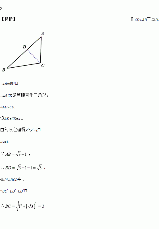 已知,在△ABC中,∠A=45°,AC=,AB=+1,则边BC的长为___.