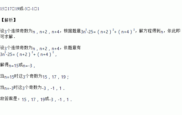 已知三个连贯奇数,其中较大的两个数的平方和比最小数的平方的3倍小25,则这三个数分别为_________________________.