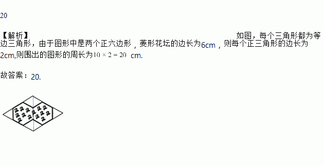 如图,菱形花坛的边长为6cm,一个内角为60°,在花坛中用花盆围出两个正六边形的图形(图中粗线部分),则围出的图形的周长为___________ cm.