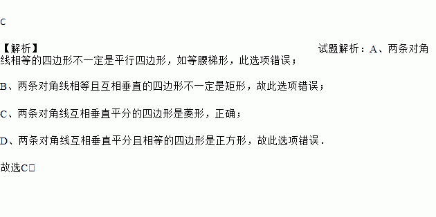 C 【解析】试题解析:A、两条对角线相等的四边形不一定是平行四边形,如等腰梯形,此选项错误; B、两条对角线相等且互相垂直的四边形不一定是矩形,故此选项错误; C、两条对角线互相垂直平分的四边形是菱形,正确; D、两条对角线互相垂直平分且相等的四边形是正方形,故此选项错误. 故选C.