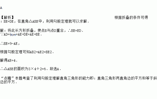 已知,如图,矩形ABCD中,AB=3cm,AD=9cm,将此矩形折叠,使点D与点B重合,折痕为EF,则△ABE的面积为( )