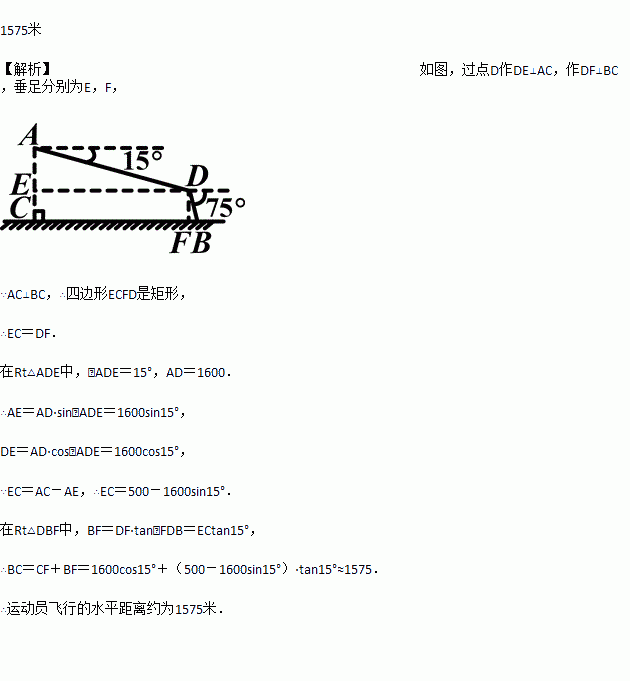 如图,某翼装飞行员从离水平地面高AC=500m的A处出发,沿着俯角为15°的方向,直线滑行1600米到达D点,然后打开降落伞以75°的俯角降落到地面上的B点.求他飞行的水平距离BC(结果精确到1m).