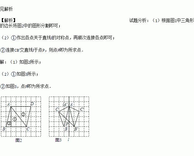 (1)如图,在图1所给方格纸中,每个小正方形边长都是1,标号为①②③的三个三角形均为格点三角形(顶点在方格顶点处),请按要求将图2中的指定图形分割成三个三角形,使它们与标号为①②③的三个三角形分别对应全等.(分割线画成实线.)