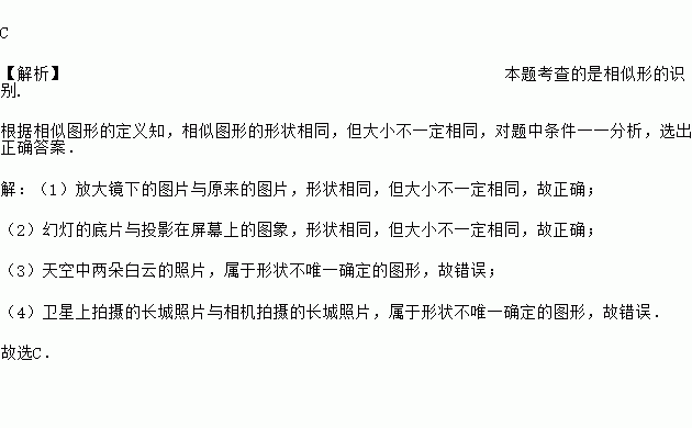 C 【解析】本题考查的是相似形的识别. 根据相似图形的定义知,相似图形的形状相同,但大小不一定相同,对题中条件一一分析,选出正确答案. 【解析】 (1)放大镜下的图片与原来的图片,形状相同,但大小不一定相同,故正确; (2)幻灯的底片与投影在屏幕上的图象,形状相同,但大小不一定相同,故正确; (3)天空中两朵白云的照片,属于形状不唯一确定的图形,故错误; (4...