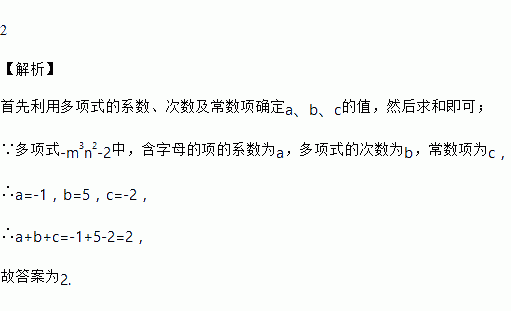 已知多项式-m3n2-2中,含字母的项的系数为a ,多项式的次数为b,常数项为c,则a+b+c=________.