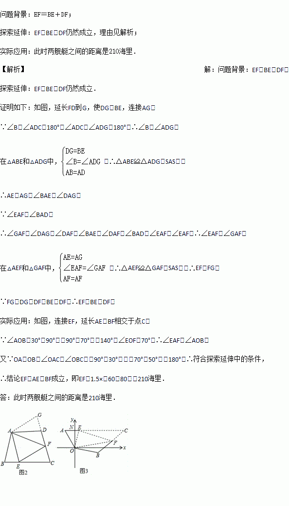 (3)如图3,在某次军事演习中,舰艇甲在指挥中心(O处)北偏西30°的A处,舰艇乙在指挥中心南偏东70°的B处,并且两舰艇到指挥中心的距离相等,接到行动指令后,舰艇甲向正东方向以60海里/小时的速度前进,舰艇乙沿北偏东50°的方向以80海里/小时的速度前进1.5小时后,指挥中心观测到甲、乙两舰艇分别到达E,F处,且两舰艇之间的夹角为70°,试求此时两舰艇之间的距离.