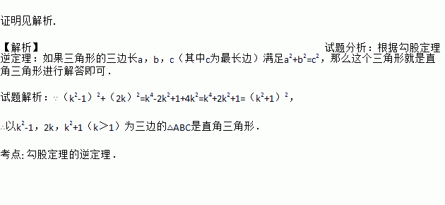 已知△ABC的三边分别为k2-1,2k,k2+1(k>1),求证:△ABC是直角三角形。
