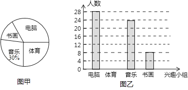 (1)试确定如图甲中“音乐”部分所对应的圆心角的大小.