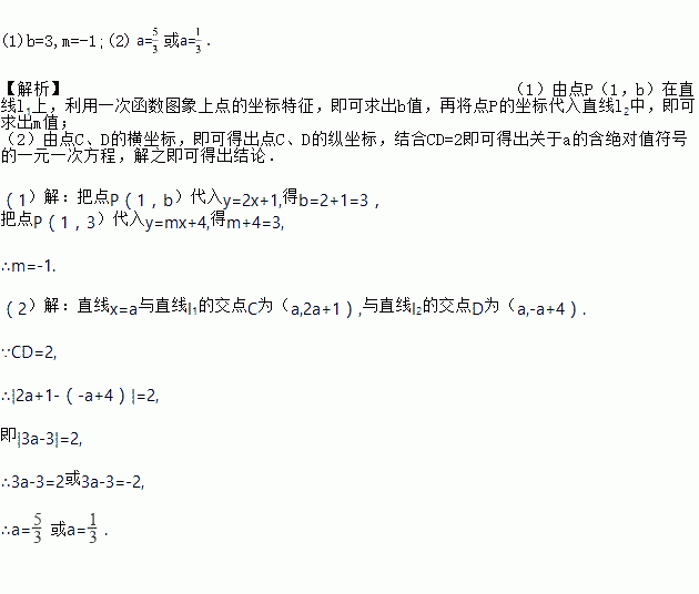 如图,直线 :y=2x+1与直线 :y=mx+4相交于点P(1,b)
