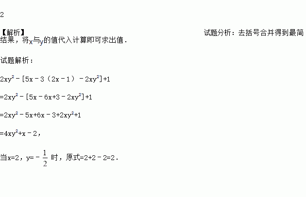 先化简,再求值:2xy2﹣[5x﹣3(2x﹣1)﹣2xy2]+1,其中x=2,y=﹣.
