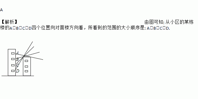A 【解析】由图可知: 从小区的某栋楼的A,B,C,D四个位置向对面楼方向看,所看到的范围的大小顺序是: A>B>C>D.