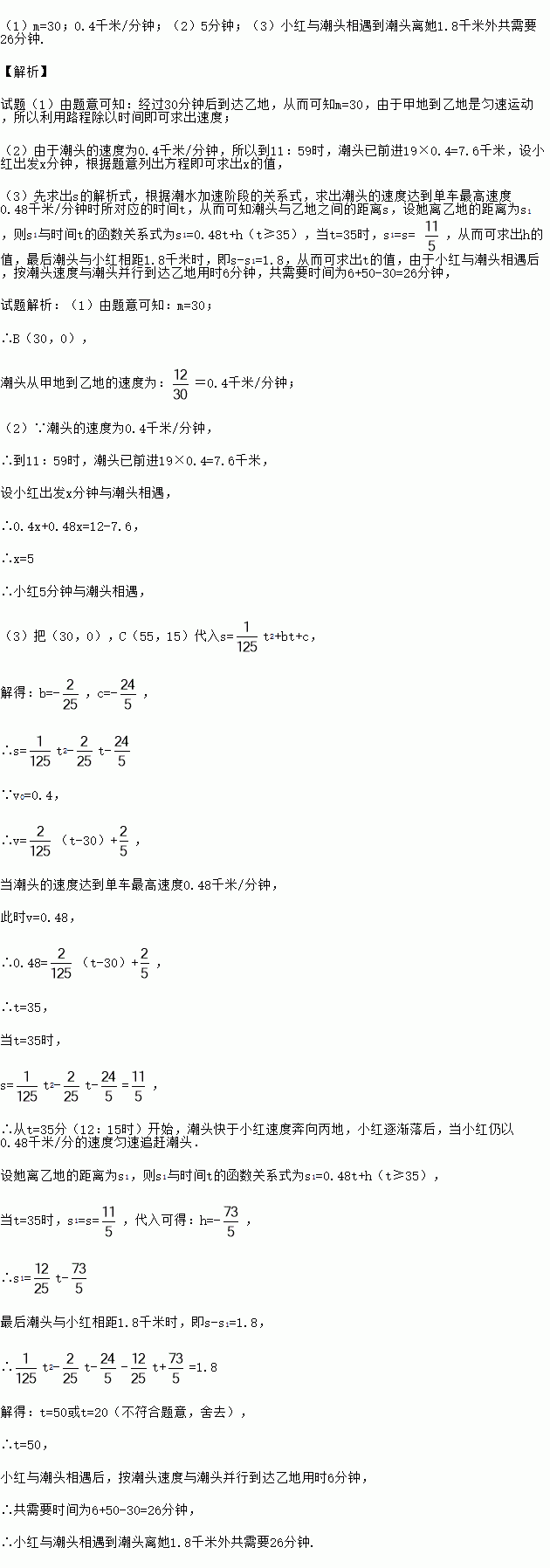 (3)相遇后,小红立即调转车头,沿江边公路按潮头速度与潮头并行,但潮头过乙地后均匀加速,而单车最高速度为