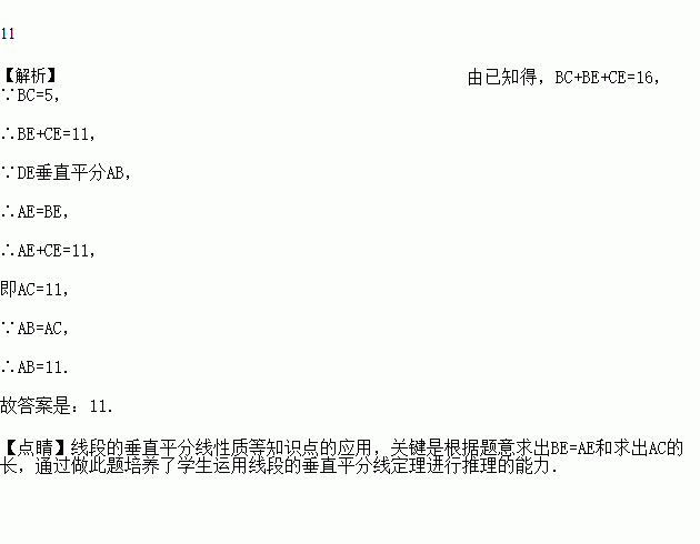 如图,△ABC中,AB=AC,DE是AB的垂直平分线,BCE的周长为16,BC=5,则AB=______.
