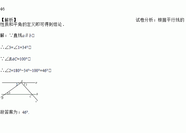 如图,直线a∥b,∠BAC的顶点A在直线a上,且∠BAC=100°.若∠1=34°,则∠2=_____°.