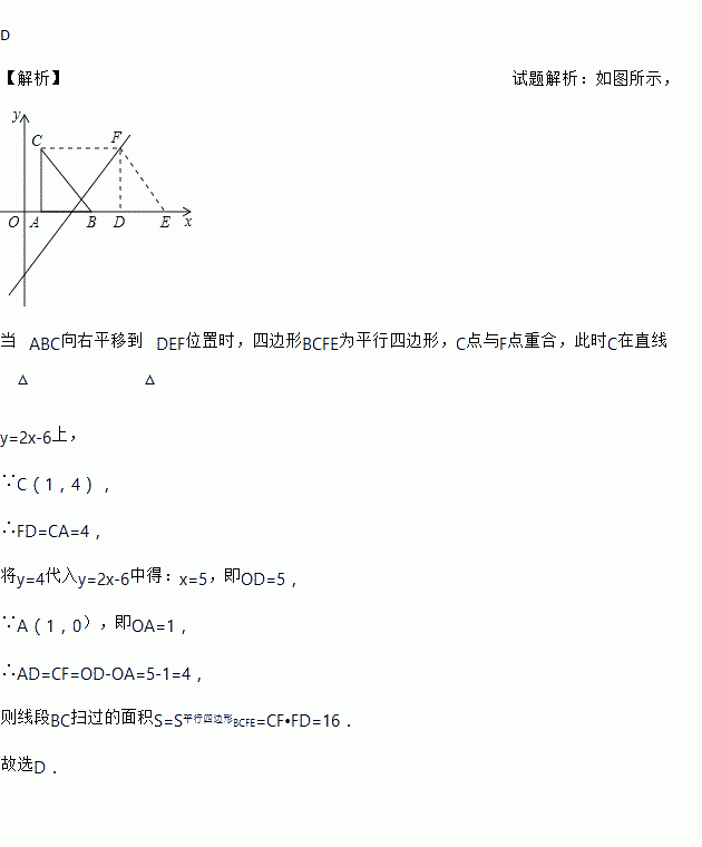 如图,△ABC的顶点坐标分别为A(1,0),B(4,0),C(1,4),将△ABC沿x轴向右平移,当点C落在直线y=2x-6上时,线段BC扫过的面积为( D )