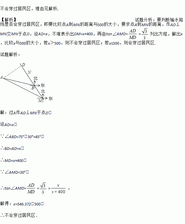 如图,MN表示某引水工程的一段设计路线,从点M到点N的走向为北偏西30°,在点M的北偏西60°方向上有一点A,以点A为圆心,以500米为半径的圆形区域为居民区,取MN上另一点B,测得BA的方向为北偏西75°.已知MB=400米,若不改变方向,则输水路线是否会穿过居民区?请通过计算说明理由.(参考数据: