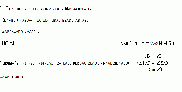 如图,AB=AE,∠1=∠2,∠C=∠D.求证:△ABC≌△AED.