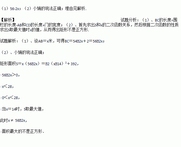 某基地计划新建一个矩形的生物园地,一边靠旧墙(墙足够长),另外三边用总长54米的不锈钢栅栏围成,与墙平行的一边留一个宽为2米的出入口,如图所示,如何设计才能使园地的而积最大?下面是两位学生争议的情境:请根据上面的信息,解决问题: